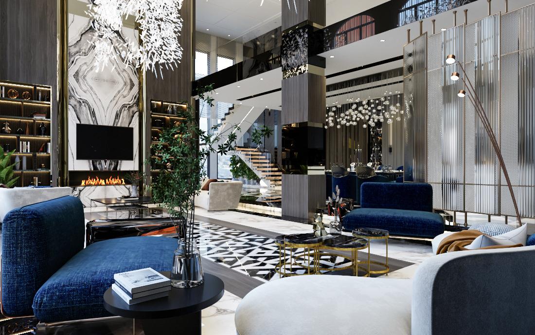The interior design includes bedrooms, living rooms, dining rooms, majlis, halls, children's